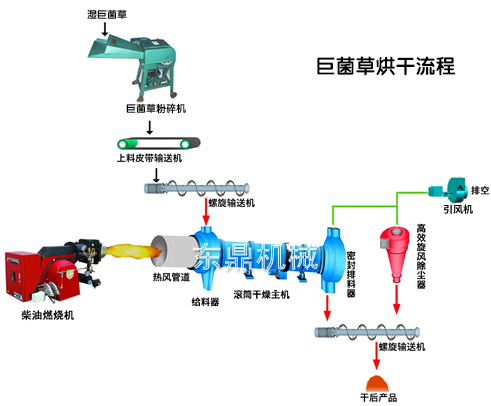 巨菌草烘干機(jī),主要由巨菌草破碎設(shè)備,巨菌草粉碎機(jī),上料皮帶運(yùn)輸機(jī),螺旋輸送機(jī),柴油燃料機(jī),熱風(fēng)管道,給料器,滾筒主干燥機(jī),密封拌料機(jī),螺旋輸送機(jī),旋風(fēng)除塵器,引風(fēng)機(jī)等組成,根據(jù)物料狀態(tài)及用途用戶可以適當(dāng)選配擠壓脫水設(shè)備和環(huán)保除塵設(shè)備。在機(jī)器工作時,濕物料先經(jīng)過巨菌草粉碎機(jī),在此過程中完整的巨菌草植株被迅速破碎,成為大小均勻的草料,然后隨著上料設(shè)備和螺旋輸送設(shè)備進(jìn)入滾筒內(nèi)部,至此,巨菌草烘干的前期準(zhǔn)備工作正式完成。在滾筒內(nèi)壁設(shè)置有鏟板,在滾筒內(nèi)部的巨菌草碎料被抄板不斷抄起,這是為了讓巨菌草可以充分和滾筒內(nèi)部的熱風(fēng)接觸,提升設(shè)備的烘干效果,達(dá)到事半功倍的作用。由于滾筒設(shè)置有傾角,因此物料會隨著滾筒轉(zhuǎn)動由一端滑向另一端,直到出料口完成物料的烘干階段,烘干好的物料會隨著出料口的螺旋輸送機(jī)被運(yùn)至包裝打包的階段,滾筒中的廢氣會進(jìn)入除塵設(shè)備,保證氣體不會污染大氣,經(jīng)過除塵脫硫之后,最終排入空氣中。